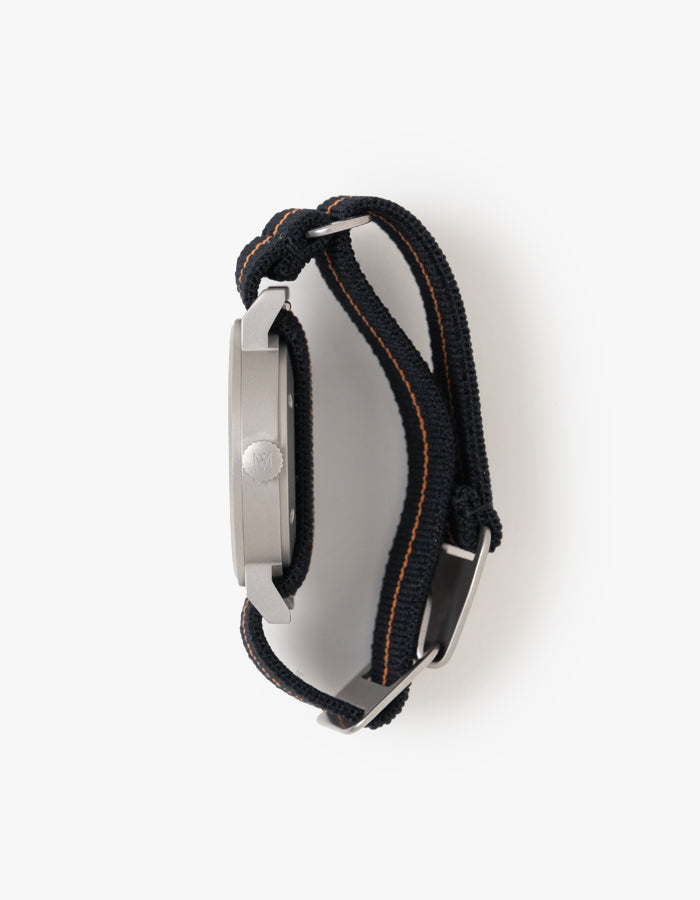 The parachute-style strap is representative of a time in watch history, properly known as The Marine Nationale Parachute Elastic Strap, has an interesting history that dates back to the 1960s and 1970s. The parachute strap is elastic, breathable and fully adjustable, perfect for everyday wear.