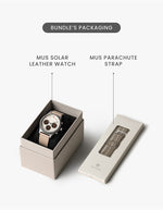 • Sleekly packed with a leather watch and an extra quick-release parachute strap, this bundle makes style changes simple, fast, and tool-free.